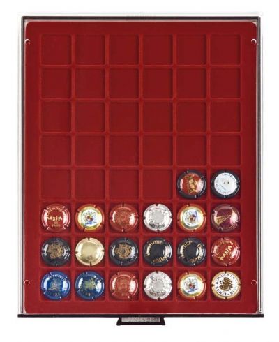 Bandeja para monedas con divisiones cuadradas para monedas, cajón transparente ahumado con plantilla de velours burdeos y carcasa transparente. 48 divisiones Ancho/Profundidad/Algo 236/303/20 mm