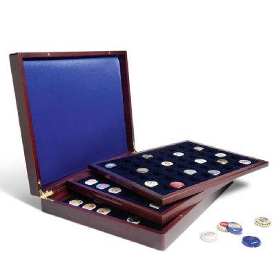 Estuche de Luxe en madera color caoba de alta calidad.Las bandejas con superficie aterciopelada contribuyen también a ofrecer un aspecto especialmente elegante.El interior de las tapas del estuche, acolcahdos con raso. Los bordes de madera de las bandejas y las bisagrfas doradas proporcionan una gran resistencia. Con 48 Divisiones cada bandeja, para placas de cava en cápsulas.
