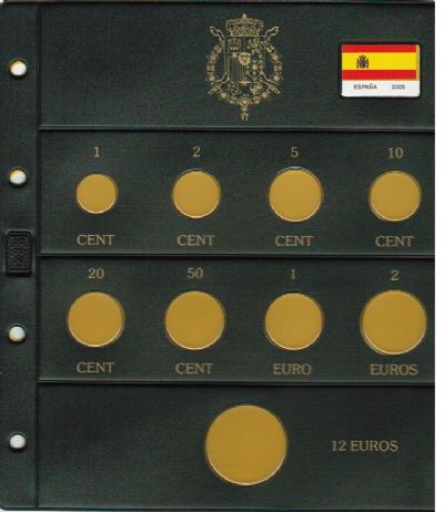 2008 Hoja Numis sistema CLARABOYA, para la serie completa de €uros de ESPAÑA 2008. Semirígida y muy robusta.Sistema de cierre posterior con tira corredera transparente que permite ver el anverso y reverso de las monedas.Incluye separador amarillo de plástico y bandera con el año.