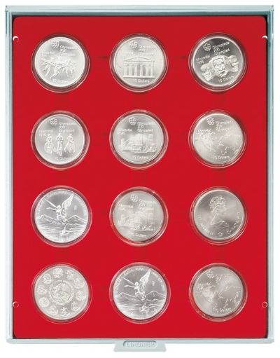 Bandeja para monedas con divisiones redondas para monedas en cápsulas, cajón de color gris claro con plantilla de velours roja y carcasa transparente. 12 divisiones Diámetro máximo moneda/cápsula 54 mm Diámetro máximo cápsula moneda 46 mm Ancho/Profundidad/Algo 236/303/20 mm