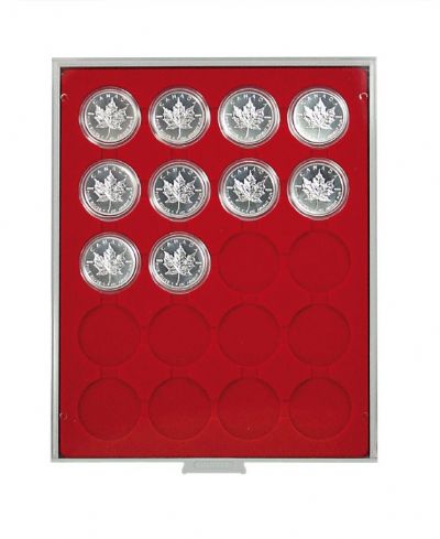 Bandeja para monedas con divisiones redondas para monedas en cápsulas, cajón de color gris claro con plantilla de velours roja y carcasa transparente. 20 divisiones Diámetro máximo moneda/cápsula 46 mm Diámetro máximo cápsula moneda 40 mm Ancho/Profundidad/Algo 236/303/20 mm