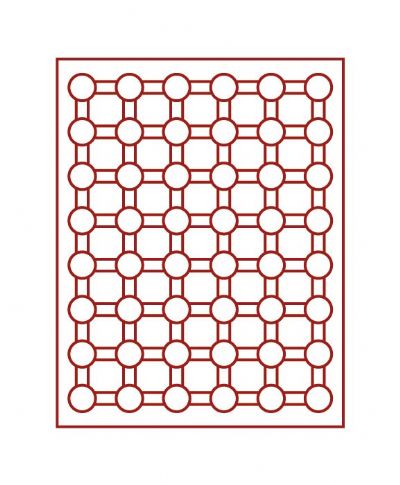 Bandeja para monedas con divisiones redondas para monedas en cápsulas, cajón transparente ahumado con plantilla de velours burdeos y carcasa transparente. 48 divisiones Diámetro máximo moneda/cápsula 24 mm Diámetro máximo cápsula moneda 16,5 mm Ancho/Profundidad/Algo 236/303/20 mm