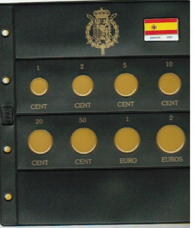 2001 Hoja Numis sistema CLARABOYA, para la serie completa de €uros de ESPAÑA 2001. Semirígida y muy robusta.Sistema de cierre posterior con tira corredera transparente que permite ver el anverso y reverso de las monedas.Incluye separador amarillo de plástico y bandera con el año.
