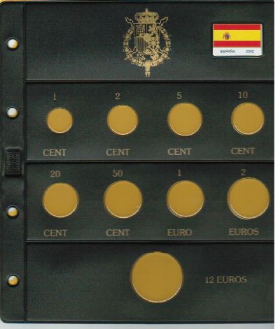 2002 Hoja Numis sistema CLARABOYA, para la serie completa de €uros de ESPAÑA 2002. Semirígida y muy robusta.Sistema de cierre posterior con tira corredera transparente que permite ver el anverso y reverso de las monedas.Incluye separador amarillo de plástico y bandera con el año.