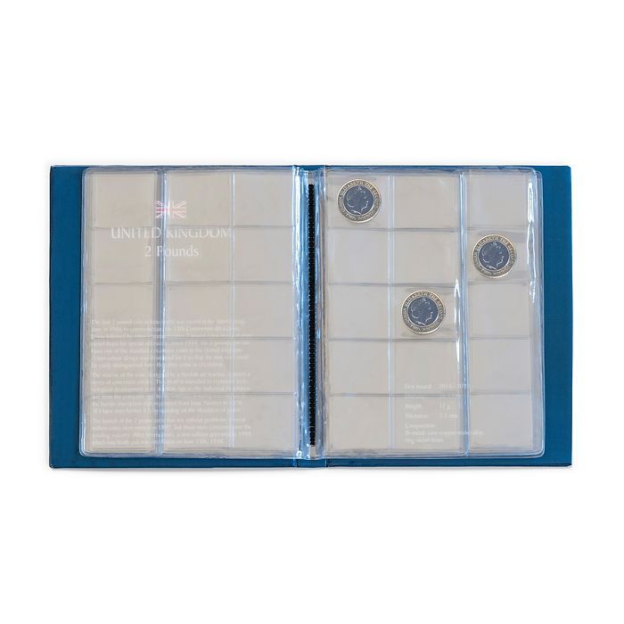 Estos álbumes con un moderno diseño tienen las tapas laminadas y, cada uno, 4 fundas firmemente encuadernadas (6 fundas en la versión «50 pence») de PVC duro (100% sin plastificantes) para las monedas correspondientes. ¡Empieza ahora una colección real!