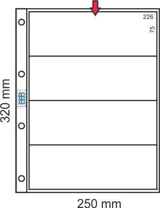 Hoja para billetes. Tamaño folio, para álbum de 27x33cm. Altamente Transparente. 4 Departamentos Horizontales. Entrada del Billete por la parte superior. 4 Anillas. Distribución 1x4 Paquete de 10 Hojas.