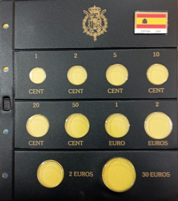 2020 Hoja Numis sistema CLARABOYA, para la serie completa de €uros de ESPAÑA 2020. Semirígida y muy robusta.Sistema de cierre posterior con tira corredera transparente que permite ver el anverso y reverso de las monedas.Incluye separador amarillo de plástico y bandera con el año.