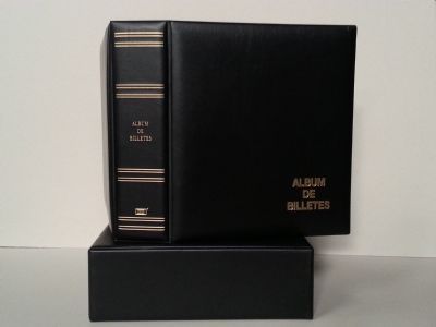 Album para BILLETES, modelo SUPERMAMUT. Fabricado en polipiel espumada bitono.Gran calidad.4 Anillas Q de 65mm de alto, lo que le confiere una CAPACIDAD EXTRA (Aproximadamente 100 hojas). INCLUYE funda cajetín de idéntica polipiel igual al álbum; lo que le confiere una gran prestancia y calidad. LOGOS en lomo y portada,referidos al coleccionismo en cuestión. No incluye hojas