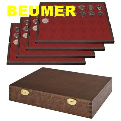 Estuche de madera auténtica maciza,CARUS. Mucho espacio.Con 4 bandejas de madera, forradas de flocado en color granate oscuro. Acabado perfecto con una superficie barnizada oscuro. La superficie es tan transparente que se ve la veta natural de la madera.Las bandejas, tienen dos encajes laterales, para asir con facilidad las bandejas a fin de extraerlas ó incluir monedas en ellas.Tiene dos cerraduras estables. 140 Divisiones. 4 Bandejas de 35 departamentos reondos; cada una, para monedas de hasta 32mm.,de diámetro. 2 €ur en CAPSULAS Medidas totales: 323x263x61mm.