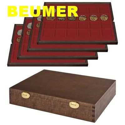 Estuche de madera auténtica maciza,CARUS. Mucho espacio.Con 4 bandejas de madera, forradas de flocado en color granate oscuro. Acabado perfecto con una superficie barnizada oscuro. La superficie es tan transparente que se ve la veta natural de la madera.Las bandejas, tienen dos encajes laterales, para asir con facilidad las bandejas a fin de extraerlas ó incluir monedas en ellas.Tiene dos cerraduras estables. 96 Divisiones. 4 Bandejas de 24 departamentos cada una, para monedas de hasta 42mm.,de diámetro. Medidas totales: 323x263x61mm.