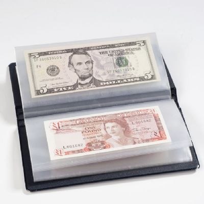 Álbum de bolsillo con 20 fundas transparentes firmemente encuadernadas que permiten poder ver el billete por ambos lados.Con un formato muy manejable.Ideal para llevarlos consigo y para días de intercambio.Tapas acolchadas.Con un grabado de color oro en la tapa.Color: azul oscuro