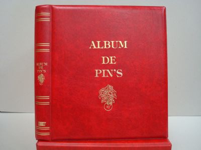Album para PINS. Tamaño 27x33cm (Folio). 4 Anillas 80/80/80. Fabircado en polipiel espumado bitono.Marcas y Logos en oro inalterable por alta frecuencia. Sin Cajetín. Incluye 5 hojas granates Color: Rojo.