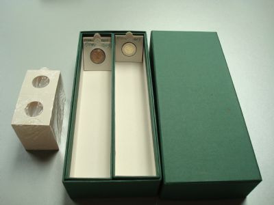 Archivador para cartones de monedas. Cartón rígido color verde. DOBLE, con dos interiores extraibles e independientes.Tapa móvil.