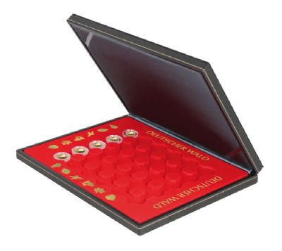 Estuche con plantilla en terciopelo rojo claro para 30 monedas en cápsulas. Incluye el motivo "Deutscher Wald" en relieve. Incluye 1 plantilla Compartimentes redondos para monedas en cápsulas Divisiones 30 Ancho/Profundidad/Alto 298/243/35 mm