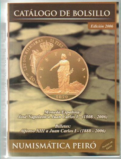 Catálogo edición de Bolsillo.Numismática Peiró.Ed.2006. Moneda Española de José Napoleón a Juan Carlos I ( 1808/2006). Billetes de Alfonso XIII a Juan Carlos I ( 1888/2006). 442 Páginas.