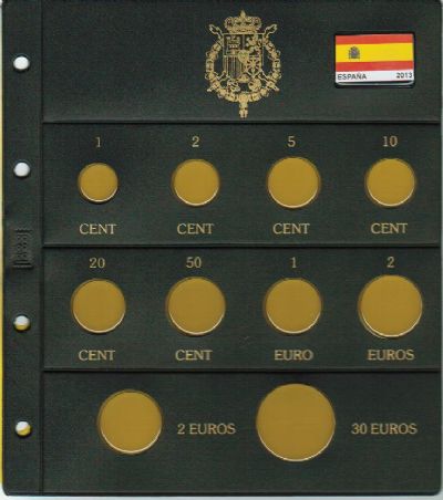 2013 Hoja Numis sistema CLARABOYA, para la serie completa de €uros de ESPAÑA 2013. Semirígida y muy robusta.Sistema de cierre posterior con tira corredera transparente que permite ver el anverso y reverso de las monedas.Incluye separador amarillo de plástico y bandera con el año.