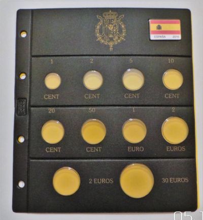 2019 Hoja Numis sistema CLARABOYA, para la serie completa de €uros de ESPAÑA 2019. Semirígida y muy robusta.Sistema de cierre posterior con tira corredera transparente que permite ver el anverso y reverso de las monedas.Incluye separador amarillo de plástico y bandera con el año.