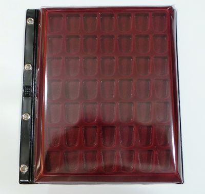 Hoja para DEDALES, luxe. Fabricada en dos cuerpos independientes. Una funda transparente exterior, con perforaciones y anillas metálicas, para inserir en las anillas del álbum, y que sirve de soporte a UNA BANDEJA EXTRAIBLE interior, en flocado en color rojo ( en el que resaltan muy especialmente los dedales). Además, la funda exterior transparente, dispone de una solapa que impide que se puedan salir. Una hoja de gran calidad; en dónde sus dedales, relucirán todo su esplendor y belleza. DETALLE DE LA SOLAPA SUPERIOR de cierre